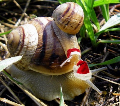 Максим Винарский писал(а): А кто-нибудь сможет определить вид изображенного на ней животного?  Запросто! Судя по тому, что глаза расположены на омматофорах, улитка принадлежит к группе наземных легочных моллюсков Stylommatophora. Судя по огромным зубам - улитка активный хищник. Сразу ясно, что это одна из гигантских суматраноклыкастых улиток (Densosurculus sumatranus, семейство Densosurculidae), живущих на островах Индийского океана. Там улитка поднимается на высокие деревья и затаившись в засаде ждет когда внизу пройдет азиатский буйвол, гаур, зебу или мелкий слон. Заметив несчастное животное улитка тут же спрыгивает ему на спину и злобно загрызает своими большими зубами  .