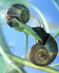 А вот очень похожее изображение живых моллюсков. тоже с сайта. Особые отличия - мантия в крапинку, щупальца более длинные, чем у аквариумной катушки такого же размера и не одноцветные. Скос устья почти не заметен.