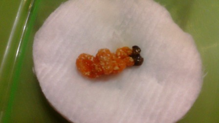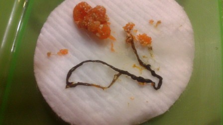 Здравствуйте! Помогите пожалуйста узнать что такое не понятное для меня в экскрементах моих уль (фото). Это началось после того,как я обнаружила у моих питомцев маленьких,толстеньких червячков в какашках именно в таком темном мешочке как на фото, а также на стенках терра в слизи были белые тонкие и прозрачные бяки-червячки похожие на паутинку (не много).Мои бедолаги сразу попали в карантин (кокосовый субстрат убрала, сидят на бумаге или в пустом терре) и от непрошеных гостей мы пока не избавились (уже 2 недели), купаю их в ромашке и даю семечки тыквы, но в какашках периодически появляются червяки,то длинные и тонкие, то толстые и короткие. Подскажите что это такое и что с этим делать? У меня две 4-х месячные ахатинки фулика,кушают, ползают, потихонечку растут, но вот эта бяка меня очень смущает, помогите пожалуйста! За ранее спасибо огромное! Вложение: