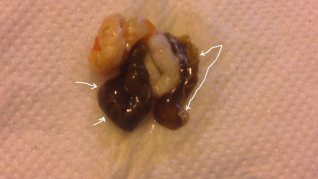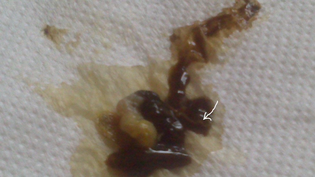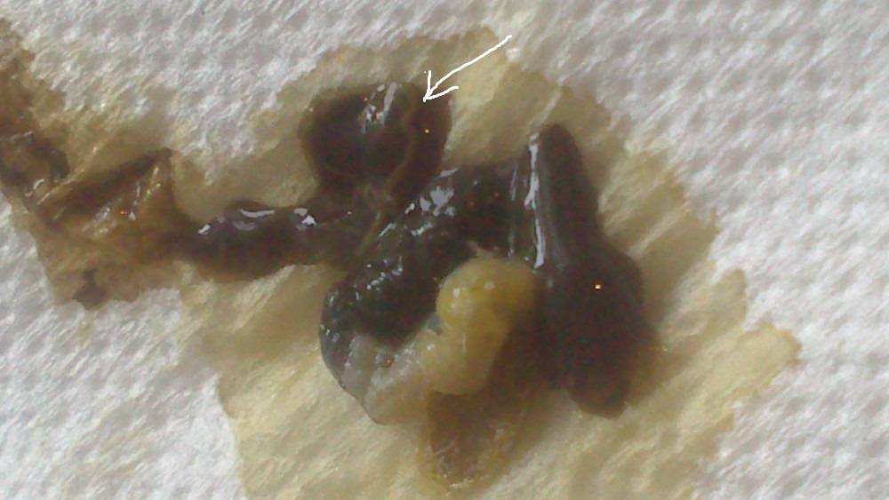Извините пожалуйста! Я не совсем поняла то, что Вы мне ответили. Я не много поясню: на фото экскременты улиток, так они ходят через день или два, в этом тёмном "чулке" что-то похожее на "червей" и они по моему не живые (но я не уверена), я пыталась их от туда вытащить и рассмотреть, но ничего не получается. В остальные дни ульки ходят в туалет тем, что кушали. Вы можете мне подсказать хотя бы на что это похоже и как мне лечить улиток. Сегодня обнаружила ещё одну такую же бяку, посмотрите пожалуйста может что-то и удастся понять? Я ни где не могу получить вразумительного ответа что это за дрянь и как от неё избавиться, может с Вашей помощью я найду выход из этой ситуации! За ранее спасибо!  Вложение:
