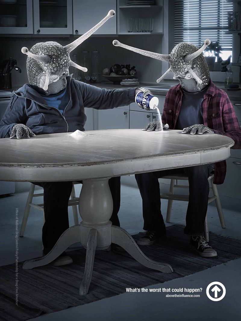 Хм... По идее должны быть брюхоногие. Только почему у них лапки? А ноги в брюках (под столом)? И еще, вопрос для специалистов (на засыпку): голова с щупальцами к какому виду относятся (если это фотомонтаж, а не маски)? А вообще же смысл не совсем ясен. При чем здесь наркотики? Или это любимое занятие улиток, или... на конопле они с маком что ли обитают?