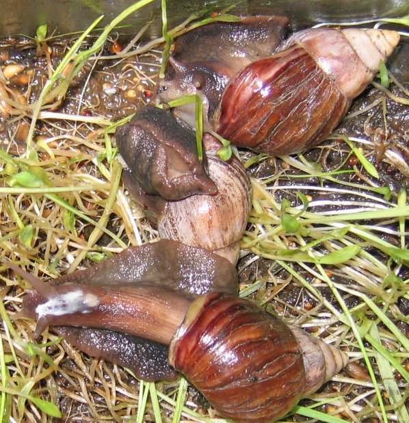 Я не думаю, что у наземных улиток окраска раковины определяется питанием. С ахатинами я не очень знаком, но с обычной у нас кустарниковой улиткой (Fruticicola fruticum) - очень даже. Приходилось неоднократно собирать её в больших количествах и в Сибири и на Урале. Вид представляет собой очень известный пример полиморфизма по окраске раковины. Бывают разные цветовые морфы. Так вот, мне постоянно приходилось наблюдать моллюсков разных морф в зарослях одного и того же растения, например, крапивы. Явно, что все эти животные питались одной и той же пищей, но имели при этом разную окраску раковины. Наверное, то же самое верно и для других видов наземных гастропод, отличающихся полиморфизмом по цвету раковины.