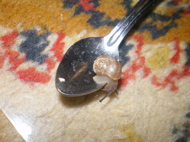 Молодая особь виноградной улитки Helix pomatia с повреждённой раковиной