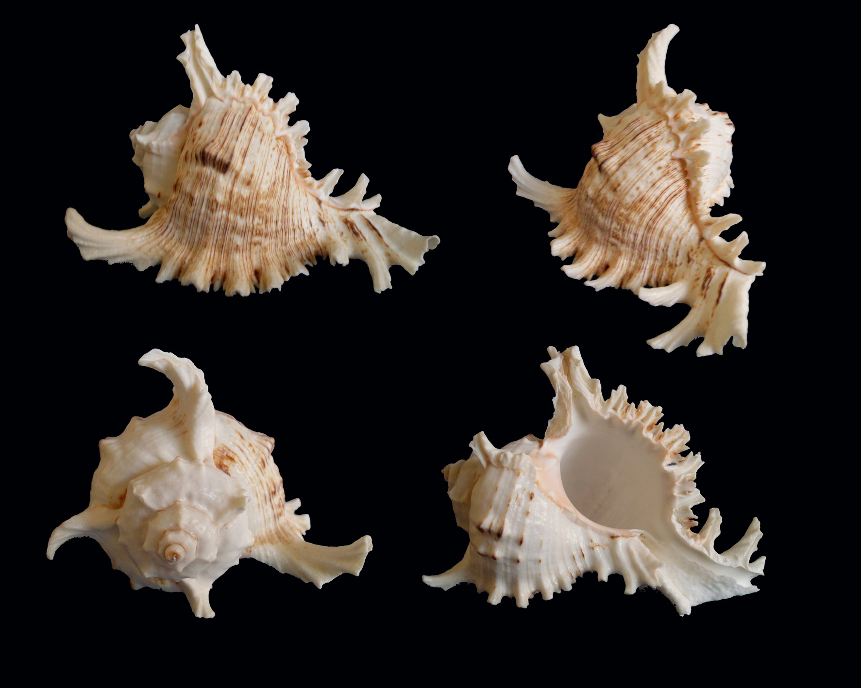Раковина мурекса рамозуса сфотографированная с разных ракурсов