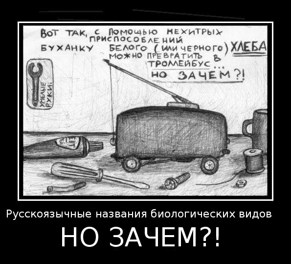 Максим, неспециалисты в любом случае будут заниматься придумыванием русских названий. Вне зависимости от того есть они или нет. у меня была где-то книжка в коей автор судя по всему подвёл латинские названия под русские (всё что катушка по русски называется - названо Planorbis по-латыни) - и ничего, красота-с. А кого из этих "популяризаторов" волнует что есть номенклатура, правила, ревизии, систематика? То же непременно произойдёт и с названиями русскими. Если не верите то посмотрите предпоследнее сообщение на предыдущей странице и первое на этой. Не находите ли некоторые разногласия? Что касается красных книг и юнатов то почему нельзя обходится транскрипциями видов? А последних можно бы и к латыни приучать... ну Вам конечно виднее...