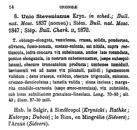 Насколько я понимаю это дело, в отечественной системе Unio stevenianus рассматривается как синоним Crassiana crassa sieversi (Drouet, 1881) [см. http://www.as.ua.edu/musselp/db.php?pro ... ic&lv=2284]. Значит, с точки зрения западных малакологов это будет Unio crassus. Так это или не так - сказать не берусь. Проблема с видами Drouet состоит в том, что этот конхолог придерживался "дробительских" позиций в выделении видов и не всегда сопровождал описания видов иллюстрациями. Вот Вам и описание вида из Друе. Заметьте, из Симферополя он этот вид тоже указывает: