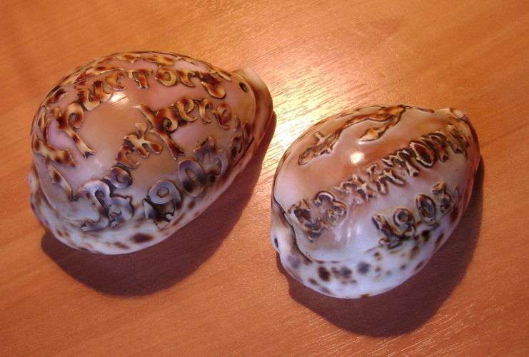 Ну, на второй раковине же вроде написано "Евпатория". Думаю, вряд ли где-то за пределами Евпатории стали бы такое вырезать на раковине =). Может им кто-то привез сувенир из Крыма? Я много раз видел похожую резьбу по ципреям и в Крыму, и в Киеве.