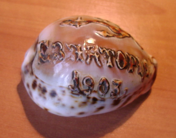 Да, я тут два раза одну раковину представил. Исправляюсь. На второй действительно надпись "Евпатория 1903", и с оборотной стороны якорь вырезан, так что сомнения в ее Крымском происхождении действительно отпадают. И еще вопрос, откуда ципреи попадают в Крым. Ныне я их часто встречаю в продаже в качестве брелоков для ключей.