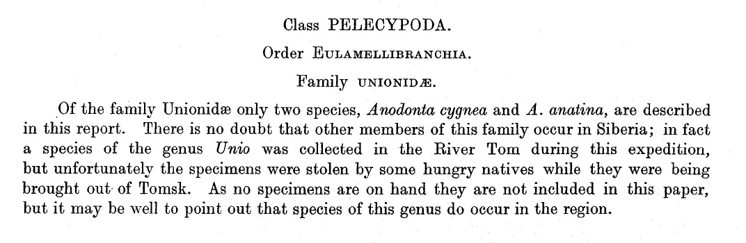 Вопрос одновременно малакологического и гастрономического порядка. Есть ли среди присутствующих на форуме малакологов и примкнувших к ним энтузиастов люди, пробовавшие на зуб двустворок семейства Unionidae? Интересно, в порядке околозоологического трепа, послушать отзывы гурманов-экстремалов и поваров-авантюристов. Действительно, едят же устриц и эскарго, почему не попробовать перловиц? В моей коллекции есть два задокументированных случая. Первый взят из мемуаров В.И. Жадина ("Отечественные гидробиологи", СПб., 1992), где он описывает, как в голодные блокадные годы собирал на Ладожском озере унионид и питался ими. Второй случай совершенно криптозоологический. Как известно, в Западной Сибири из унионид живут только беззубки, истинные перловицы (род Unio) отсутствуют (кроме самых западных частей бассейна Иртыша, где реки текут с водораздела Уральского хребта). И вот у Алана Мозли, американского малаколога, изучавшего в 1932-1933 гг. малакофауну Сибири, нахожу такой занимательный отрывок (см ниже). Одним словом, были у него в коллекции "несомненные Unio" из реки Томь, но при их транспортировке в Томск раковины были украдены "голодными туземцами" и, надо полагать, съедены. С тех пор, ещё раз замечу, никто и никогда в Томской области Unio не находил. Неужели последних съели?