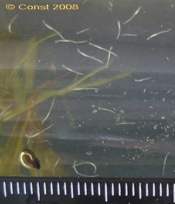 Тут подвернулся случай сделать фото этих червячков. Обнаружил в одной банке неимоверное количество. Крупных моллюсков там не осталось, так что не с кем было, наверно, сожительствовать. И они скопились на стекле. Не удержался показать, возможно кому-нибудь еще придется столкнуться с ними.