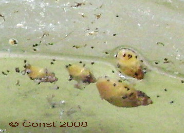 С микрофотографией у меня, конечно, проблема. Предлагаю взамен другие фото. Подозреваю, что эти клещики могут питаться слизью или другими выделениями моллюска. И вот кладки яиц прудовиков объедают, хотя сами яйца не трогают. Только связующую среду. Да и при большом их количестве улитки явно выглядят угнетенными. Еще заметил, что клещи скапливаются на органических остатках, которыми по-видимому и в основном питаются: капустных листьях, сухом корме.