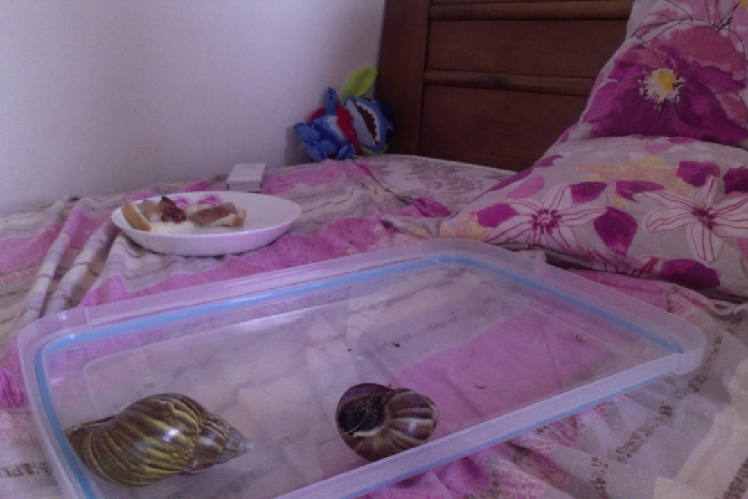 Две улитки вида ахатина фулика.Первая улитка (которая слева) в возрасте 5 месяцев.Была найдена на 18 этаже в нашем доме.Вторая улитка (правая) была найдена около моей школы.возраст 3 месяца.Обе улитки живут в мягком земляном грунте.